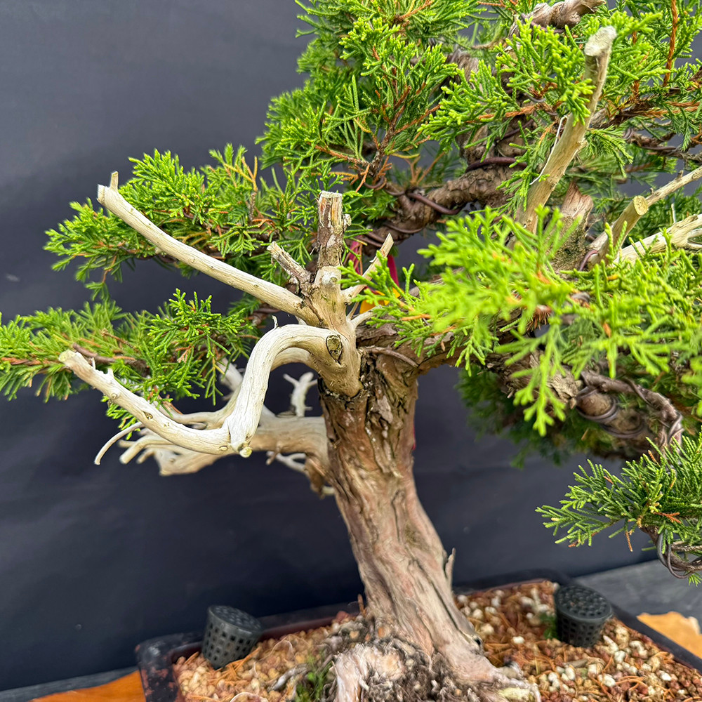 This Gerald Rainville grown Kishu Shimpaku is a commanding tree with a powerful traditional form, enhanced by rugged trunk character and striking deadwood features. The aged bark and twisting live vein tell the story of decades of careful growth, while the flowing branch structure creates movement and drama.