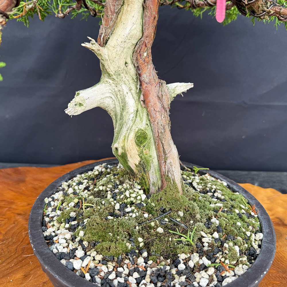 This Gerald Rainville grown Kishu Shimpaku is a stunning example of natural artistry, showcasing an elegant curved trunk with striking deadwood features. The live vein twists gracefully alongside the aged bark, creating dramatic contrast and adding visual depth that immediately draws the eye.