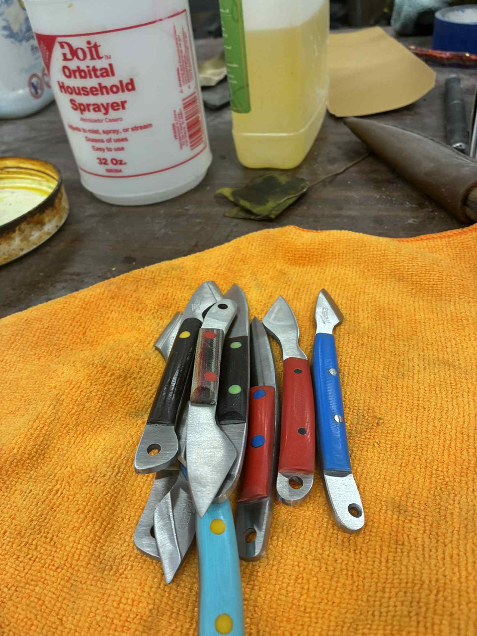 Choose from a selection of one-of-a-kind handle colors — turquoise, red, black, olive, blue, and more — available in both left- and right-handed configurations. Each knife is hardened to approximately 60 HRC, oiled for protection, and includes a signed certificate of authenticity and care card.