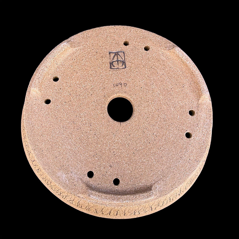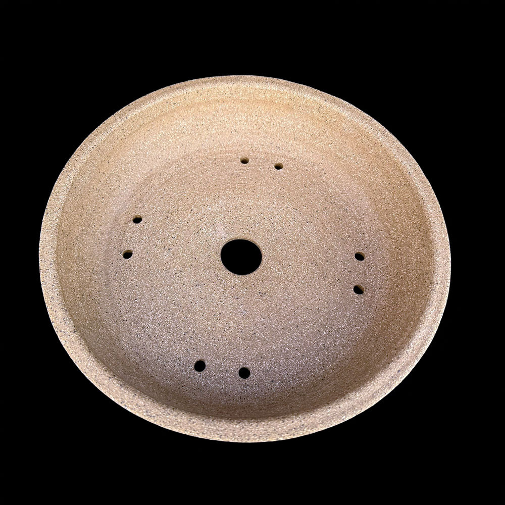 This shallow round pot from Andy Arnault features a cracked, branching texture that evokes dried riverbeds and ancient clay. The warm buff stoneware body is unglazed and finely speckled, giving it an earthy presence perfect for naturalistic bonsai displays. Its low profile and wide planting surface make it an excellent match for broad-canopied deciduous trees, literati compositions, or companion plantings. A beautifully understated container for those who value balance, texture, and authenticity.