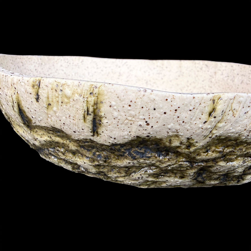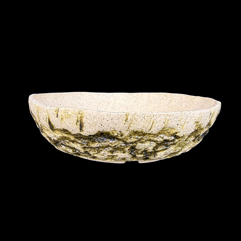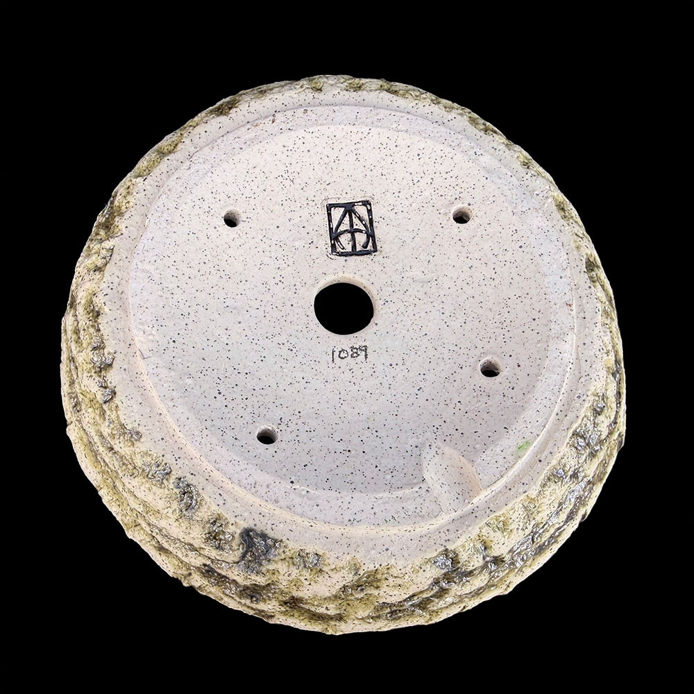 This Andy Arnault pot captures the feeling of a weathered rock face, with a carved lower band that mimics natural stone and pockets of moss. The raw ivory clay body remains exposed above the textured ridge, giving the piece a striking contrast between smooth and rugged surfaces. A soft wash of olive-green and charcoal glaze settles into the carved details, creating depth and a sense of age. Ideal for lovers of wabi-sabi aesthetics, this pot pairs beautifully with collected material, shohin conifers, or accent plantings that need an earthy, landscape-inspired container.