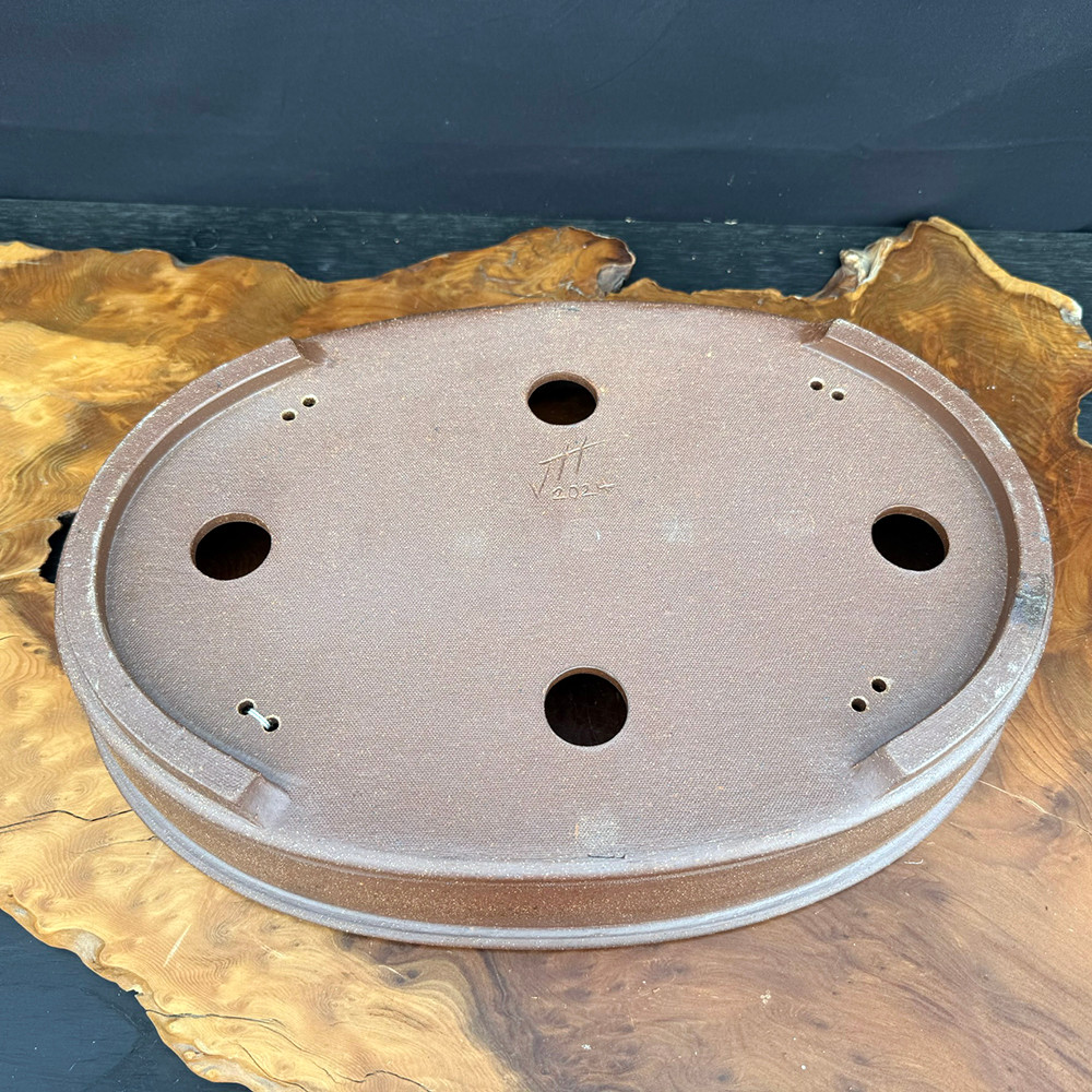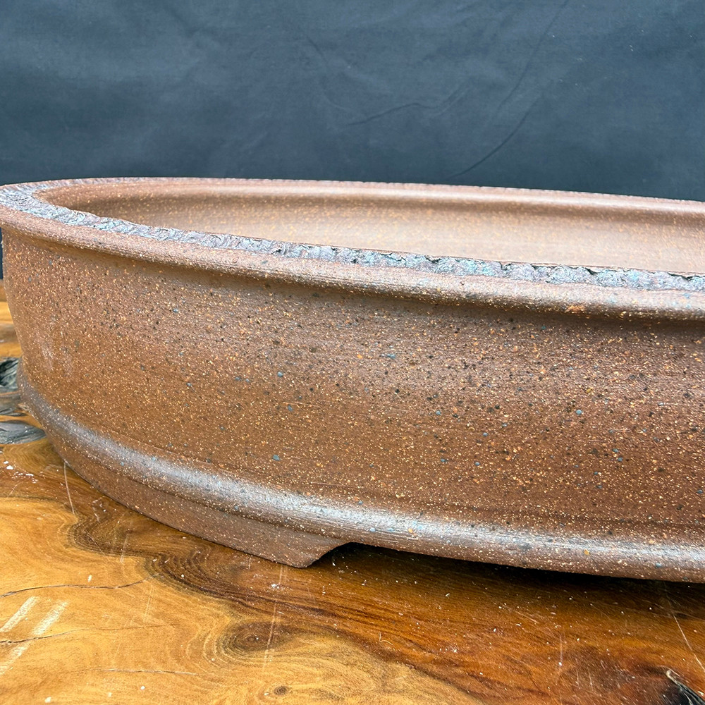 This elegant oval bonsai pot by Jack Hoover highlights the natural beauty of unglazed brown stoneware with a subtle, textured rim dusted in cool ash tones. Its refined simplicity and warm earthen color emphasize balance and proportion, allowing the tree to remain the focal point. Signed and dated 2024, this pot is ideal for refined pines, maples, or forest compositions.