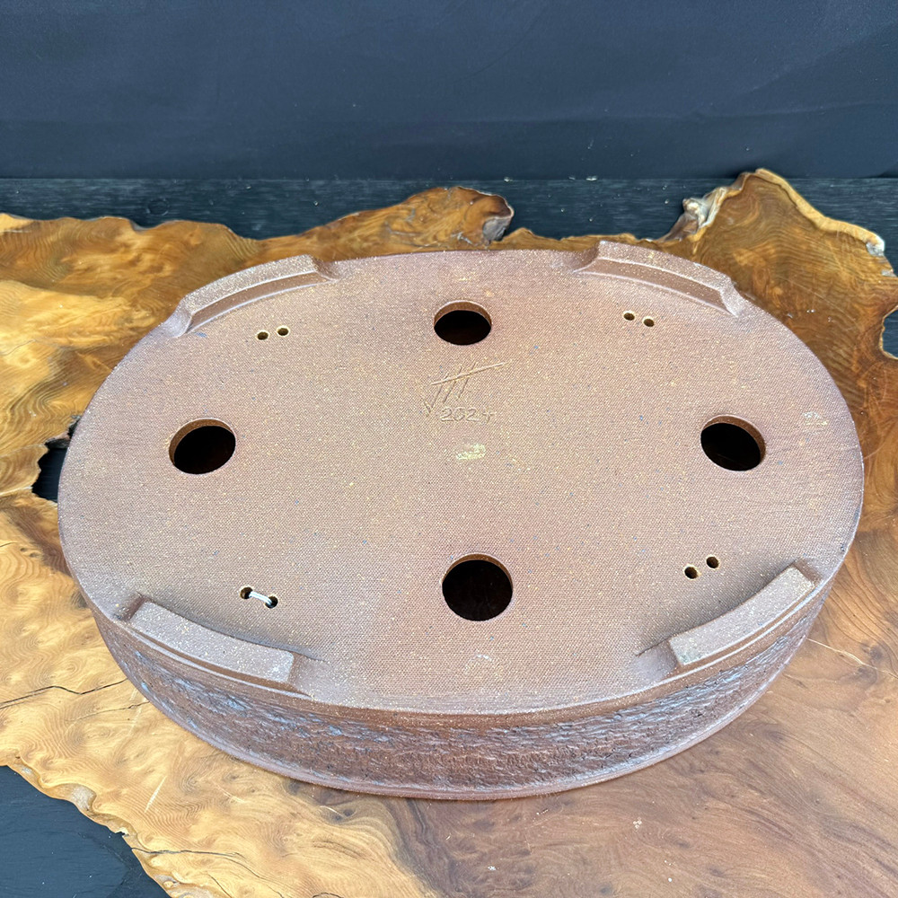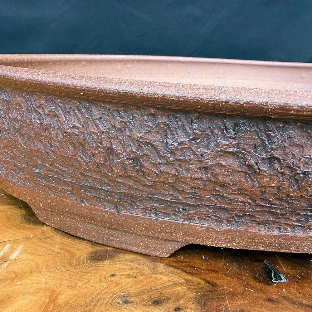 This handcrafted oval bonsai pot by Jack Hoover features a richly textured bark-like exterior in natural brown stoneware. Its warm, unglazed finish highlights the clay’s character, while sturdy feet and clean inner walls provide stability and excellent drainage. Signed and dated 2024, it embodies Hoover’s signature blend of rustic surface texture and refined form — ideal for conifers, deciduous bonsai, or forest compositions.
