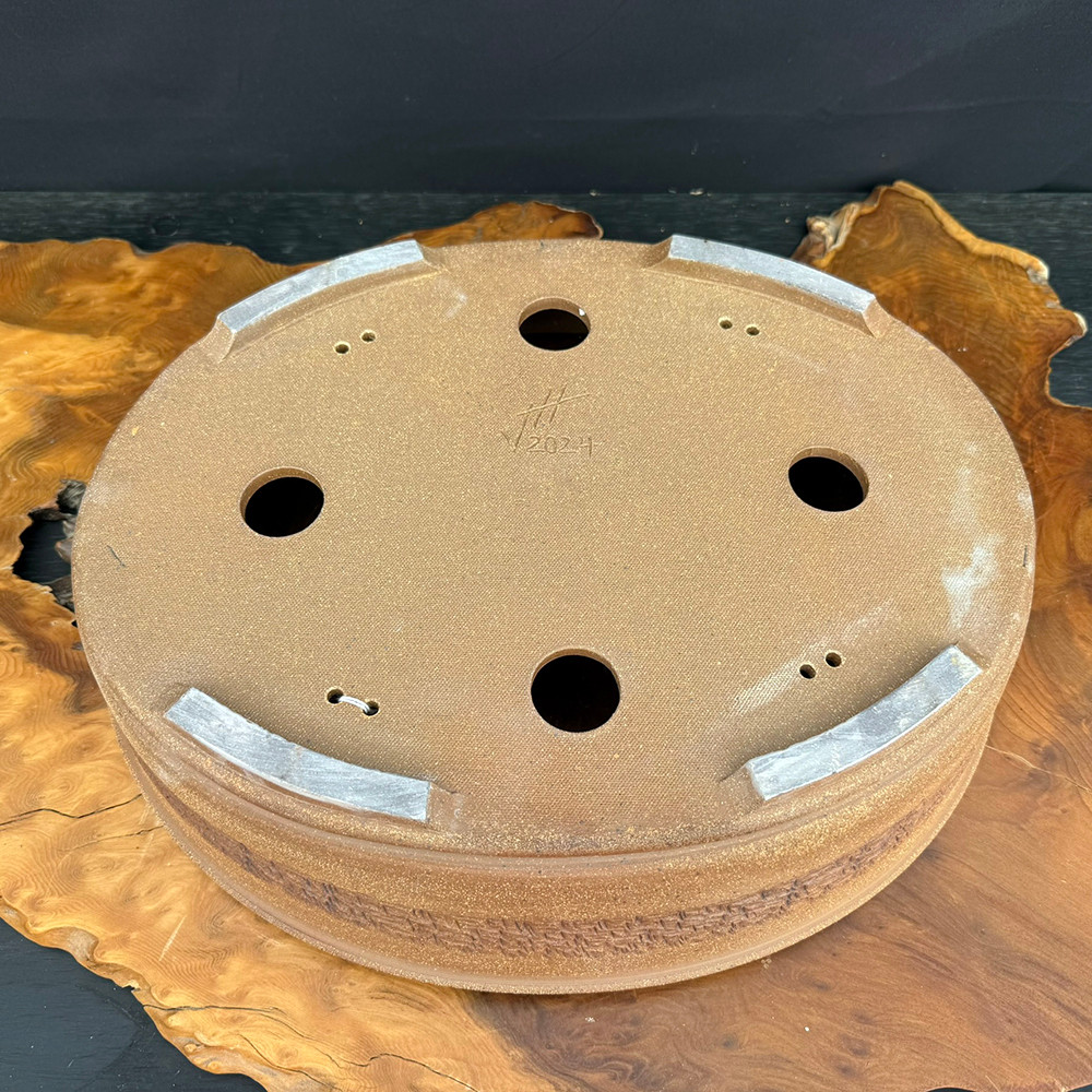 This oval Jack Hoover bonsai pot is crafted from unglazed brown stoneware and features a hand-carved horizontal texture wrapping around the body. The fine detail and earthy tone bring warmth and balance, making it a beautiful match for classic deciduous or evergreen bonsai styles.