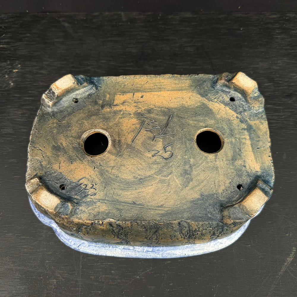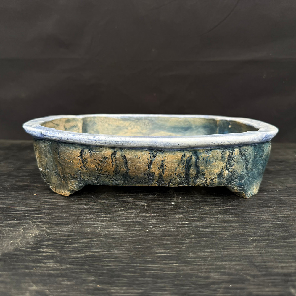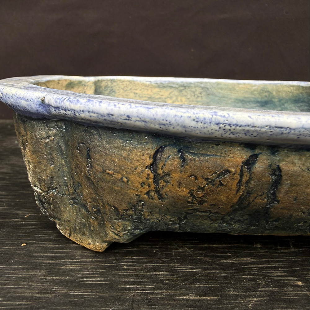 This rect-oval bonsai pot shows off a cool blue wash with vertical streaks that mimic natural bark patterns. The pale rim frames the form, while earthy underlayers shine through the wood-fired surface. Balanced and refined, it’s excellent for medium bonsai or fine-branched deciduous trees.