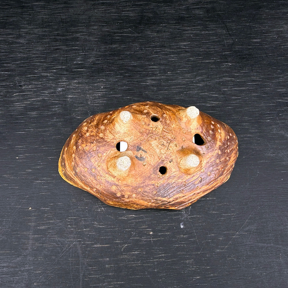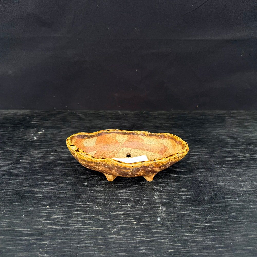 Small oval pot with mottled golden-brown and smoky dark surfaces created by the wood-fire. The irregular rim adds organic character, while the speckled finish brings depth. Perfect as a shohin container or accent pot with strong rustic appeal.
