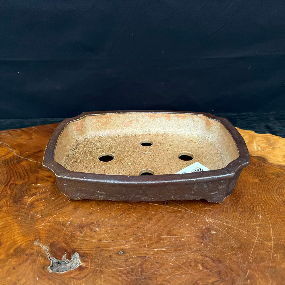 Rectangular pot with dark chocolate-brown sides and a warm stone-cream interior. The wood-fire has left soft tonal variation and texture across the hammered surface. Clean rim and traditional form make this a versatile fit for upright maples or literati-style bonsai.