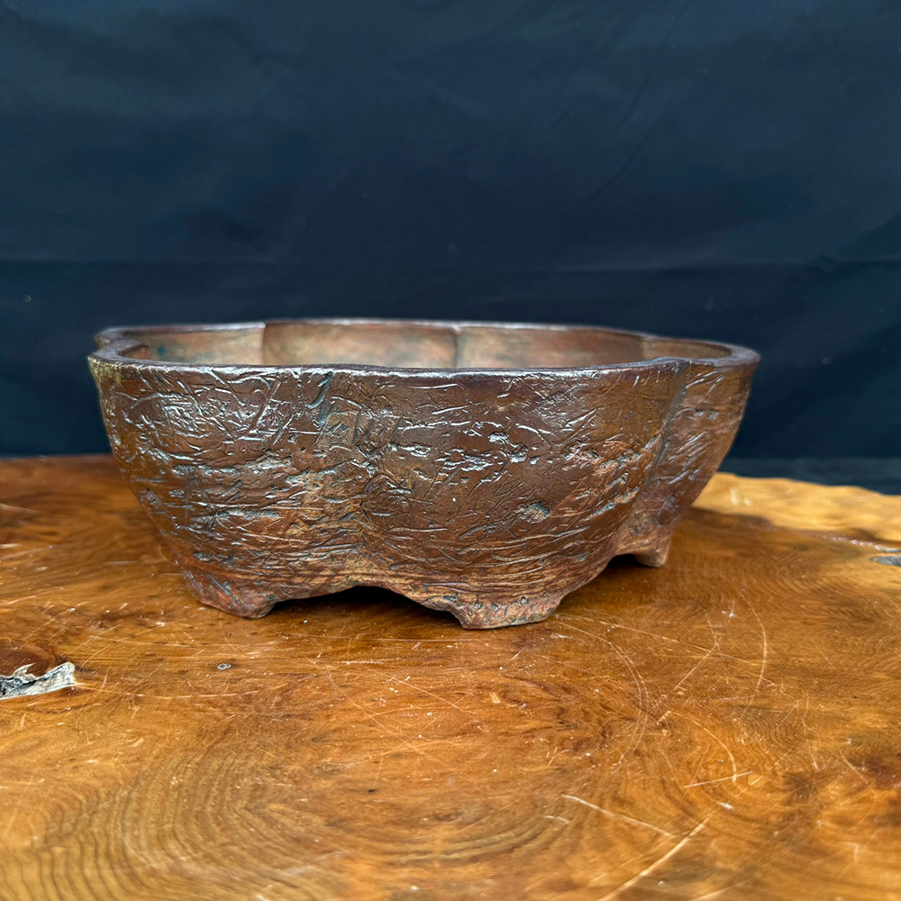 Generous mokko form with a bronze-to-copper surface and richly textured, hammered feel. Wood-firing created dark, smoky passages and metallic glints across the facets. A statement container with presence for medium trees.