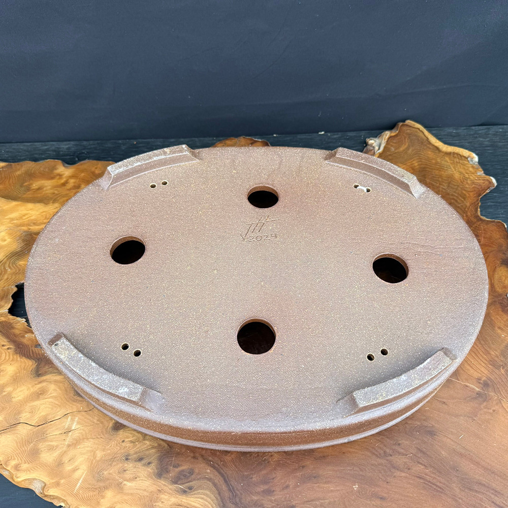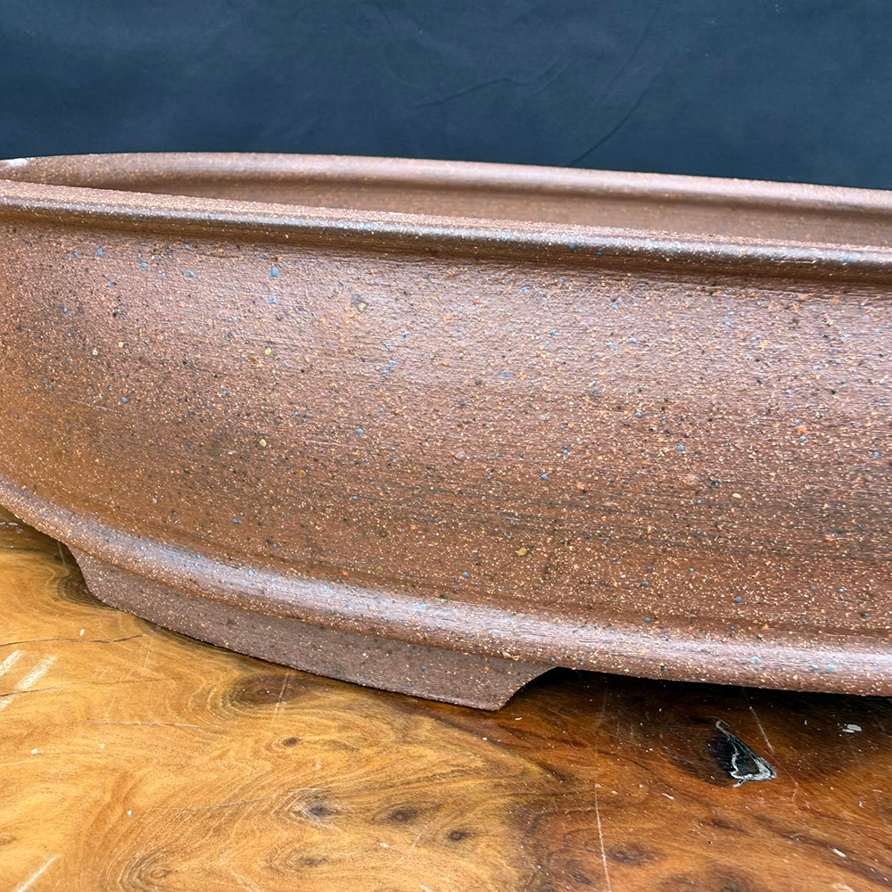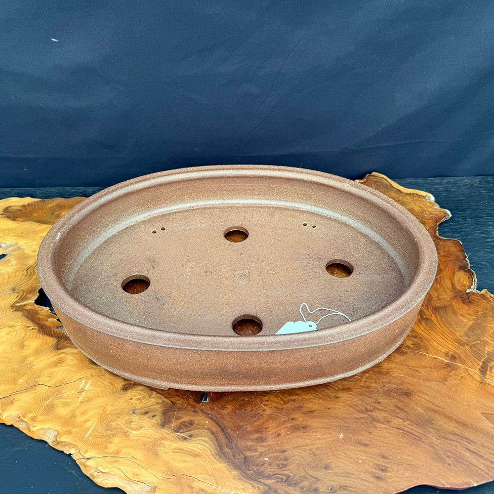 This oval unglazed Jack Hoover bonsai pot is crafted from warm reddish-brown stoneware with a fine, natural texture. Its low profile, soft rim, and sturdy feet create a refined foundation perfect for displaying broad, mature bonsai or elegant group plantings.