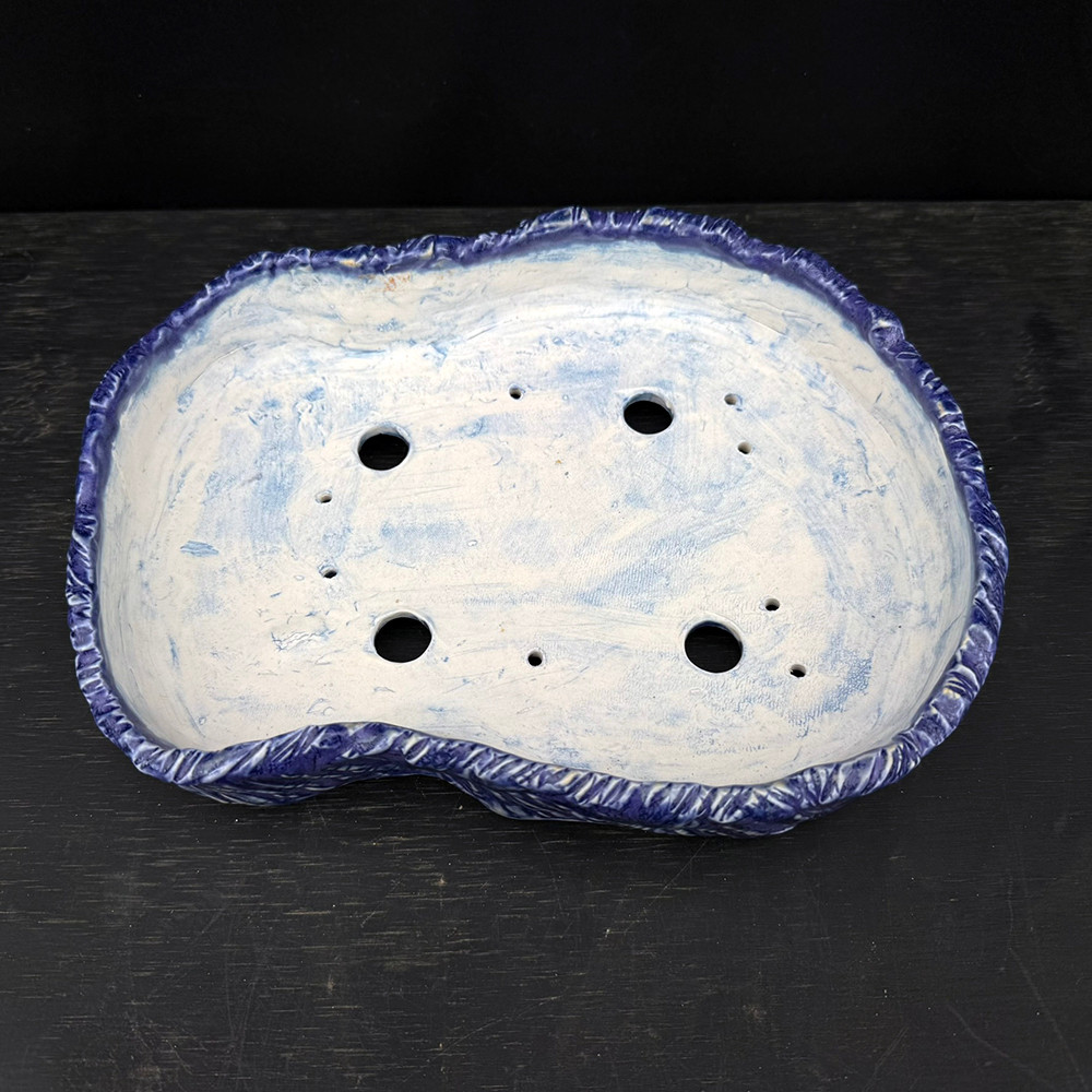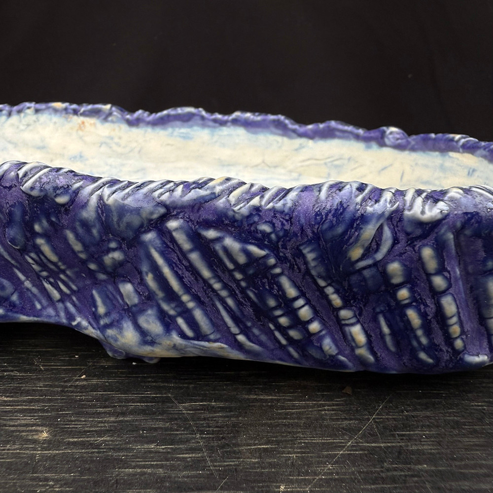 This abstract oval pot by John Fazzino stands out with its deep cobalt glaze and heavily textured exterior. The glaze flows over a carved surface, creating an energetic, almost kinetic appearance that’s both sculptural and functional. The undulating rim adds organic movement, while the interior features a smooth, light clay wash that brightens the planting space.
