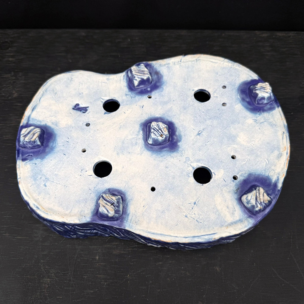The base features six distinct feet, each carved and highlighted in rich blue. Drainage and wiring holes are carefully integrated, and the stone-like finish is the result of John’s high-grog clay and precise firing process.