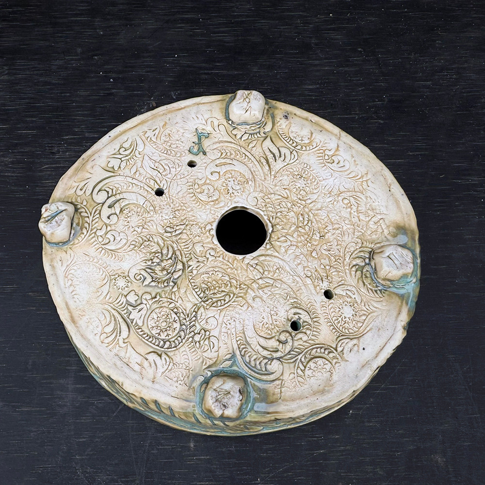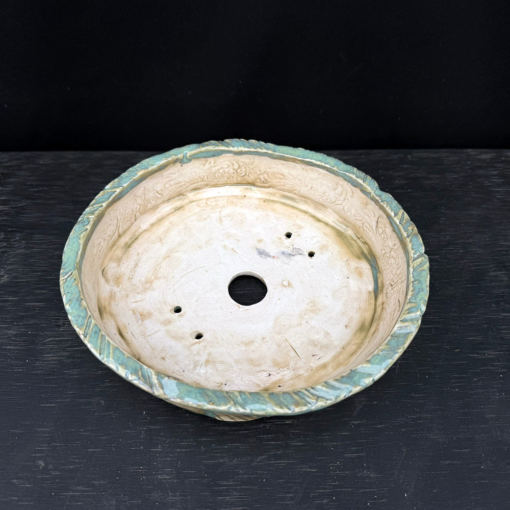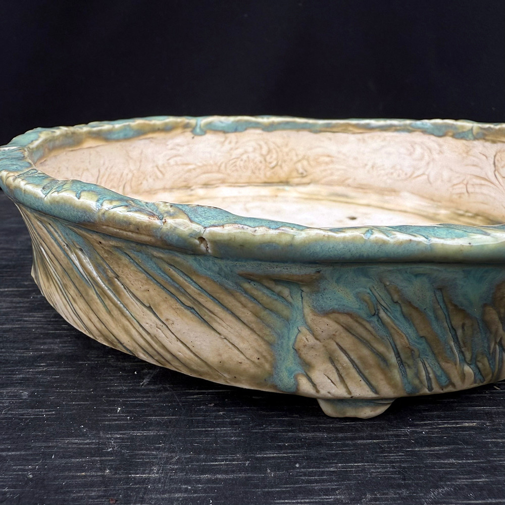 This oval bonsai pot by John Fazzino is a dynamic blend of earthy tones and intricate detail. A soft cream base meets flowing turquoise glaze, which drips naturally across the hand-carved vertical textures. The organic rim is slightly irregular, adding visual movement, while the interior wall features subtle raised floral impressions that echo the highly decorative carved underside.