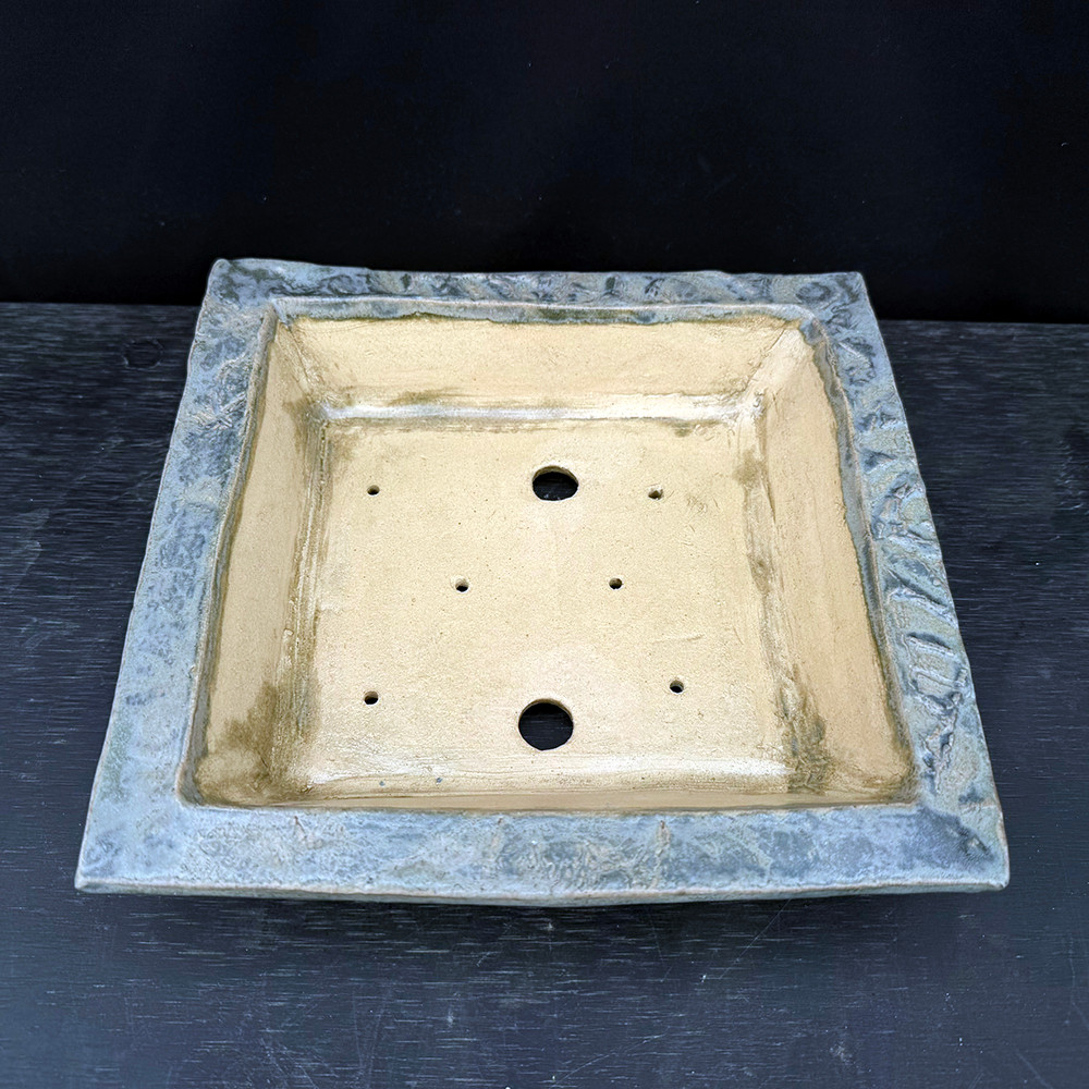 This wide, shallow square pot by John Fazzino feels calm and grounded with its soft blue-gray tones and subtle speckled texture. The exterior features hand-applied surface patterns and a rim that’s just slightly uneven—giving it an organic feel that pairs beautifully with deciduous trees or forest plantings.