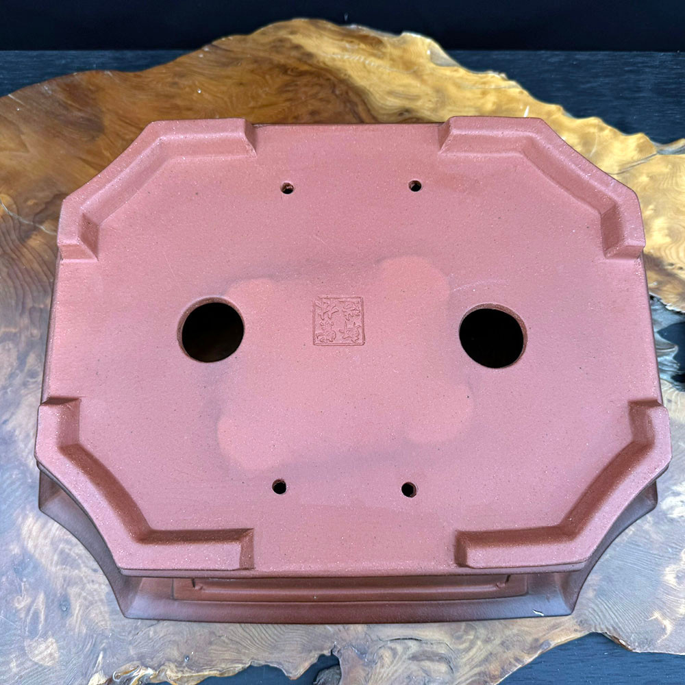 This is the kind of pot that makes a statement—bold, rustic, and ready for a centerpiece tree. The soft reddish-brown clay with dark edges gives this large octagonal Yixing bonsai pot a weathered, antique feel, while the crisp panel detailing and flared rim bring a refined finish to the form.
