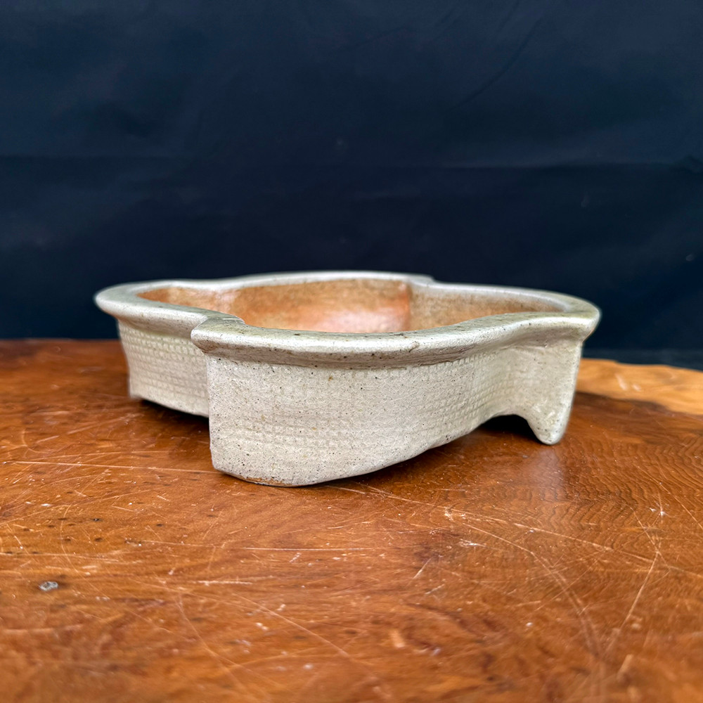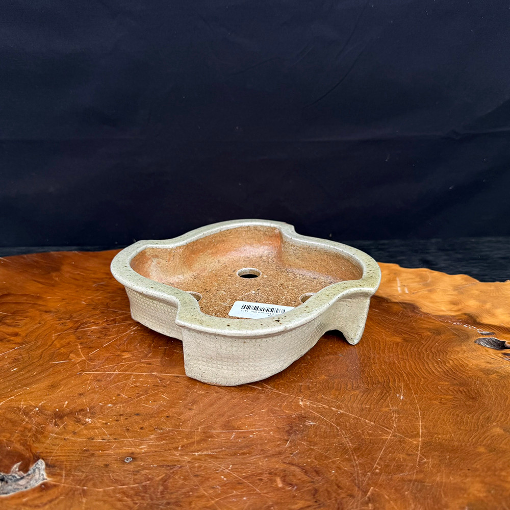 Light stone-cream body in a compact round with a soft matte surface. Fine tool marks and gentle firing speckle give quiet sophistication; warm terracotta interior adds depth. A clean, airy stage for flowering or fruiting shohin.