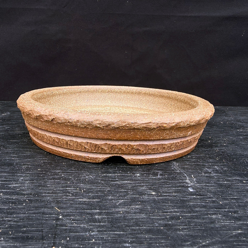 A character-rich shohin oval in natural clay featuring a hand-worked rough-edge rim and layered textured bands around the body. Small size, big presence.