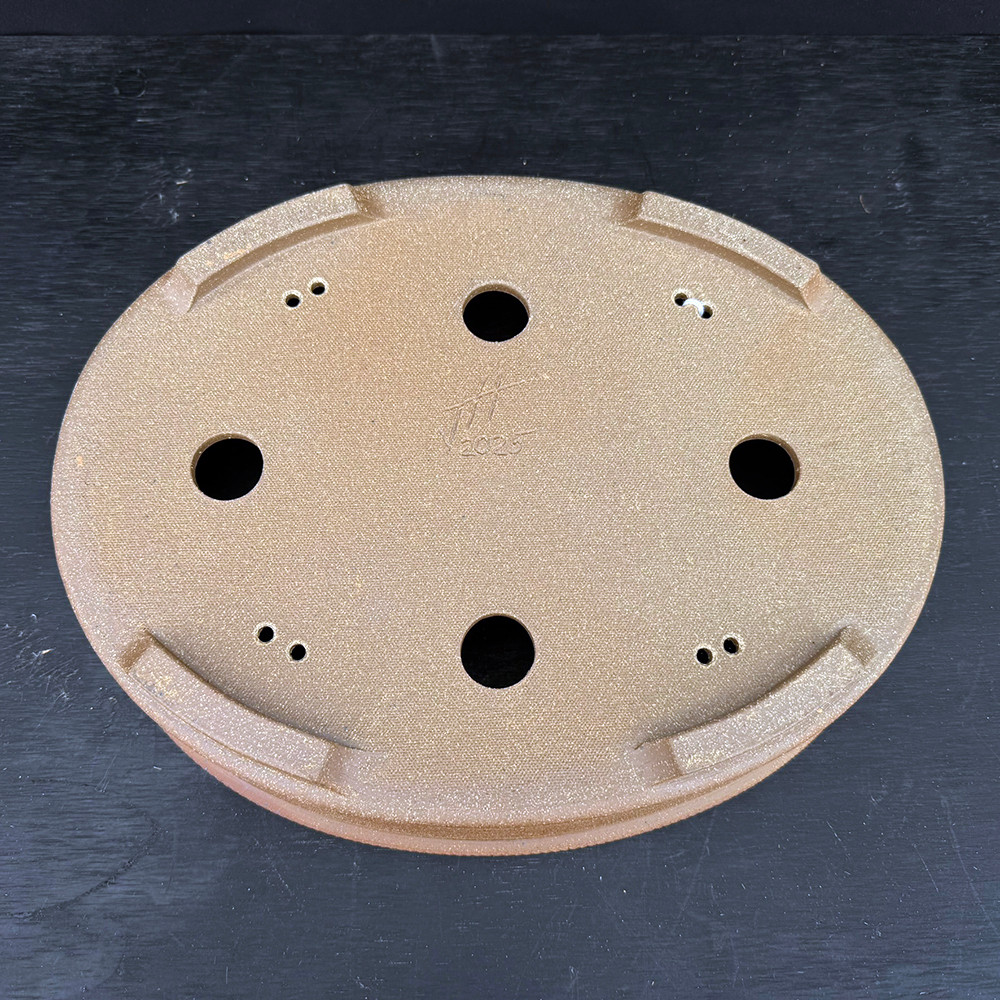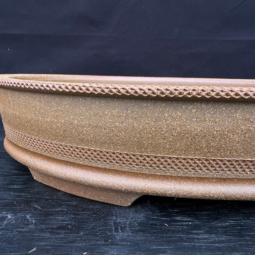 This handcrafted oval bonsai pot features a slightly deeper profile with a rustic clay finish. The textured sides bring added dimension, making it a strong choice for medium bonsai needing a more substantial container.
