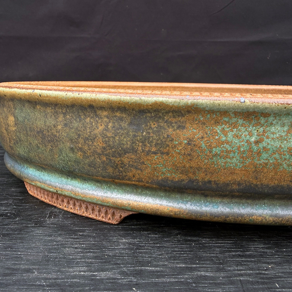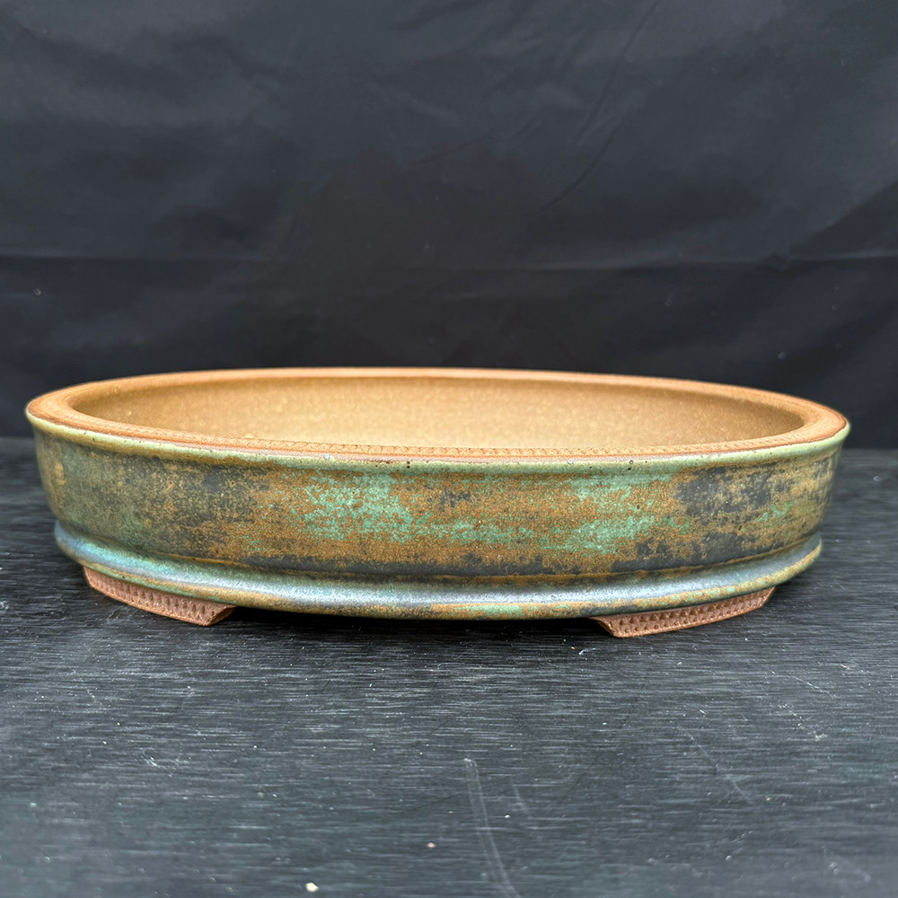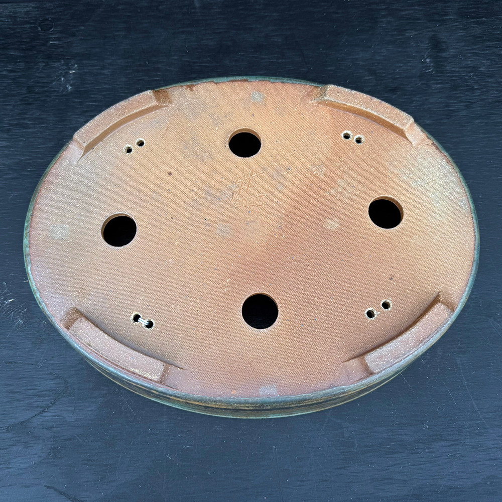 This handcrafted oval bonsai pot by Jack Hoover showcases a rich unglazed clay body with a rounded lip and raised foot ring. Its deeper profile makes it an excellent choice for species that require more root space or dramatic styling.