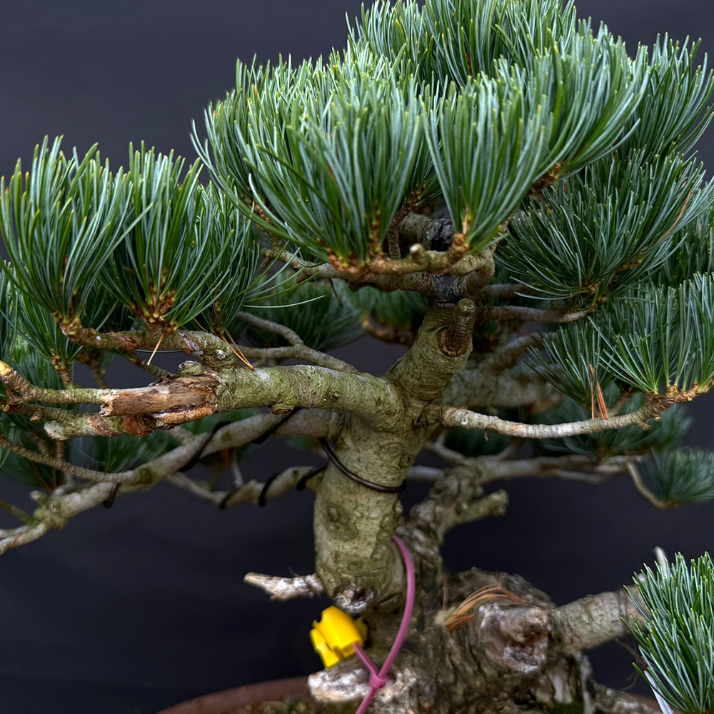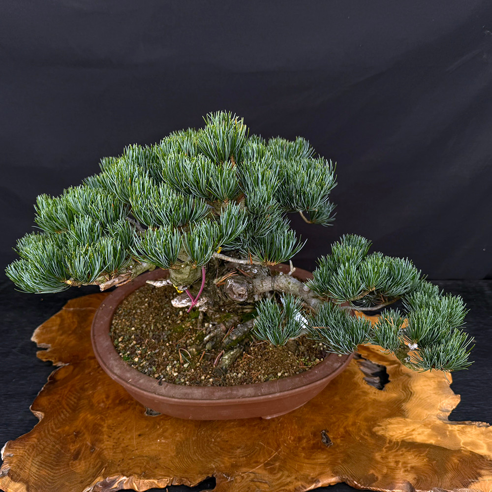 Also known as the Five-Needle Pine, this Japanese White Pine has been expertly crafted on Japanese Black Pine understock—a traditional technique that enhances strength and vigor while preserving the refined blue-green needles characteristic of the species.